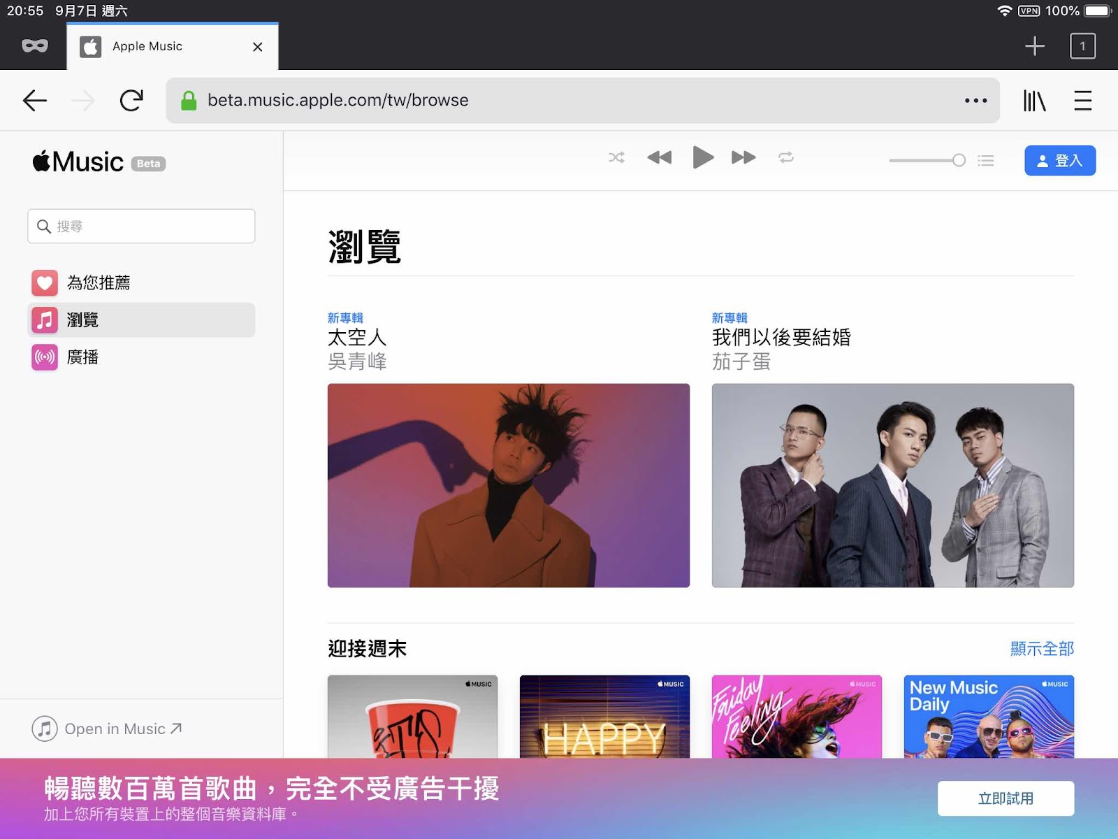 不需要下載App,只要登入Apple Music 網頁版(Beta),就可以免費使用1~3個月(看地區國家的方案有所不同),不過目前還沒有辦法透過網頁版申請試用,還是必須前往iOS、Mac或Android來訂閱。